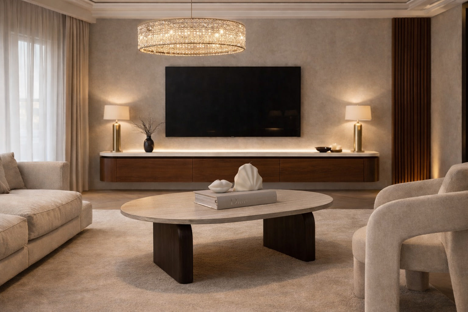 De zachte bruine tint gecombineerd met het travertine look bovenkant creëert een rustige, unieke Japandi uitstraling. Dankzij het minimalistische ontwerp blijft de focus op harmonie en ruimte, terwijl de praktische opbergruimtes ervoor zorgen dat je woonkamer altijd netjes en georganiseerd blijft.